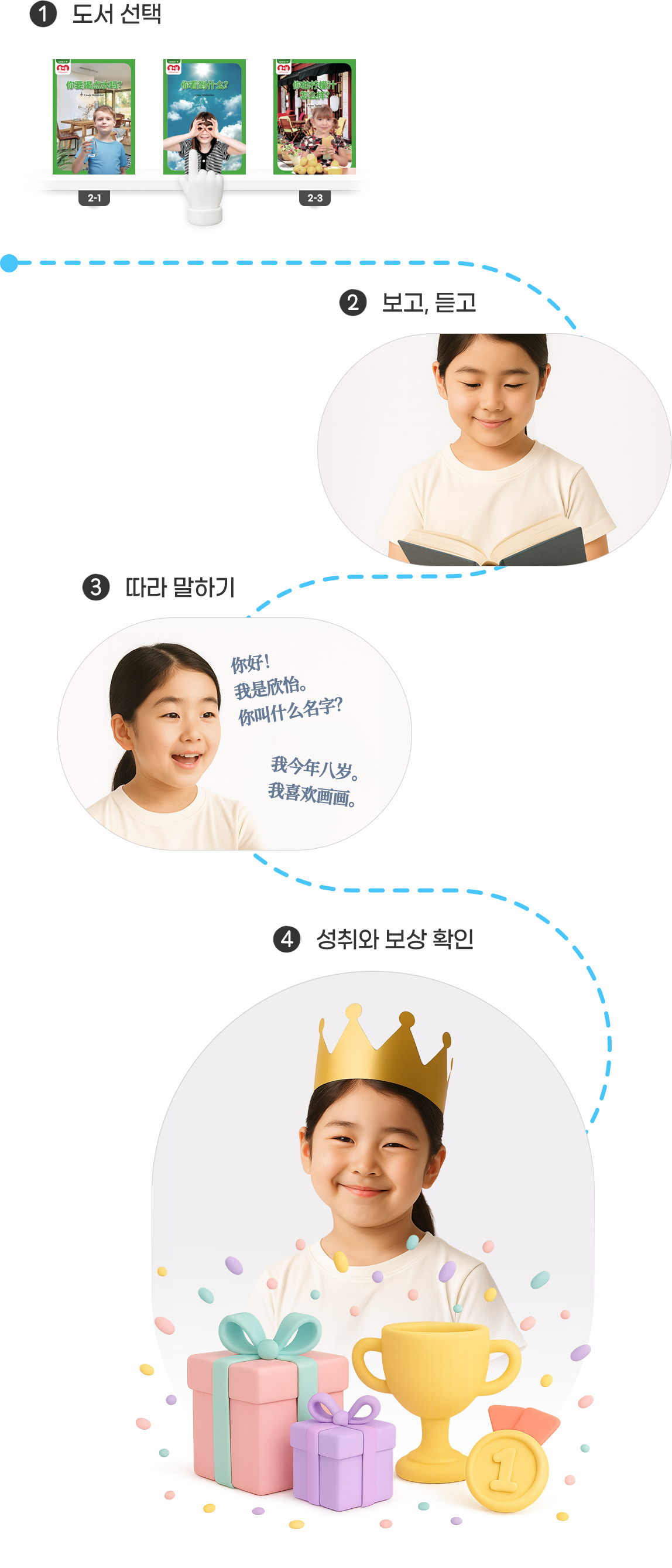 아이의 눈높이에 맞춘 단계별 콘텐츠로 성조부터 통문장까지 자연스럽게 익힐 수 있습니다.