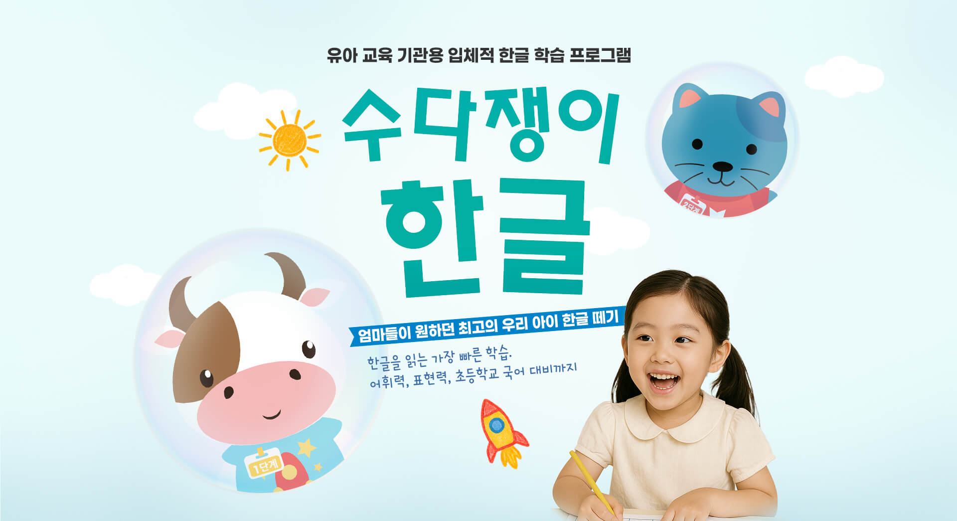 “수다쟁이 한글”은 과학적인 한글의 원리를 재미있는 학습 영상으로 자연스럽게 깨우쳐 스스로 읽고 쓸 수 있는 프로그램입니다.